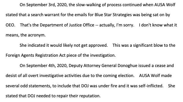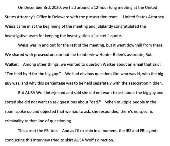 Shapley in May 2021 memo: "Through interviews and review of evidence obtained, it appears there may be campaign finance criminal violations. AUSA Wolf stated on the last prosecution team meeting that she did not want any of the agents to look into the allegation. She cited a need… twitter.com/i/web/status/1…