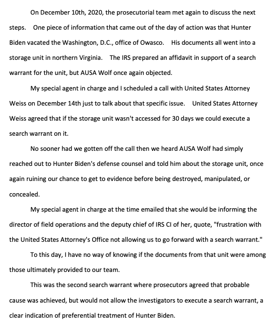 IRS investigators want to get a search warrant for unit where Hunter Biden's documents are stored. Assistant U.S. Attorney Lesely Wolf seemingly comes to the Bidens' rescue again, tipping Hunter's lawyers off to unit. Shapley: "This was the second search warrant where prosecutors… https://t.co/VtZReIYx2Qtwitter.com/i/web/status/1…