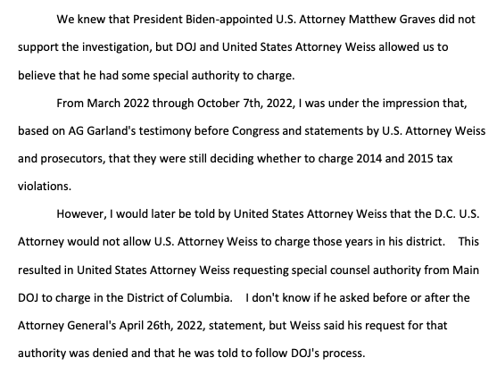 Delaware U.S. Attorney Weiss reportedly requested special counsel authority to charge Hunter Biden in D.C. -- over wishes of Matthew Graves. DOJ denied him that authority