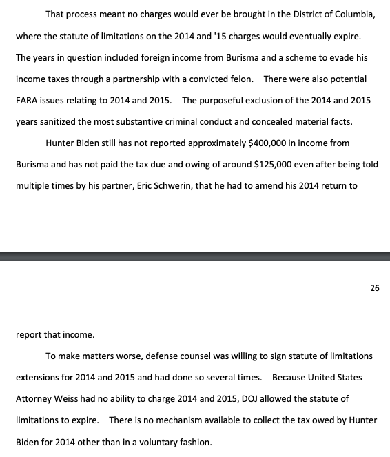 "That process meant no charges would ever be brought in the District of Columbia, where the statute of limitations on the 2014 and '15 charges would eventually expire. The years in question included foreign income from Burisma and a scheme to evade his income taxes through a… twitter.com/i/web/status/1…