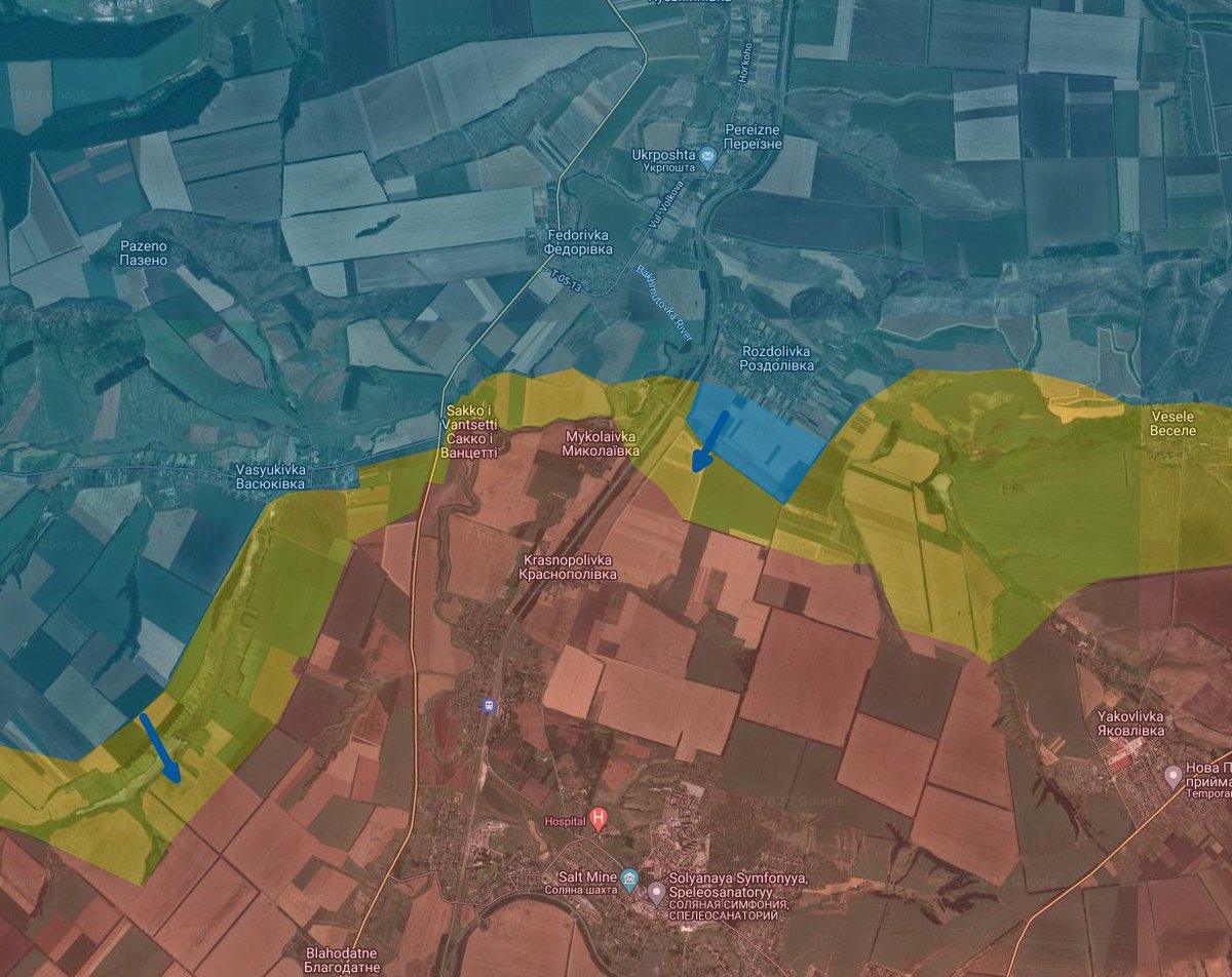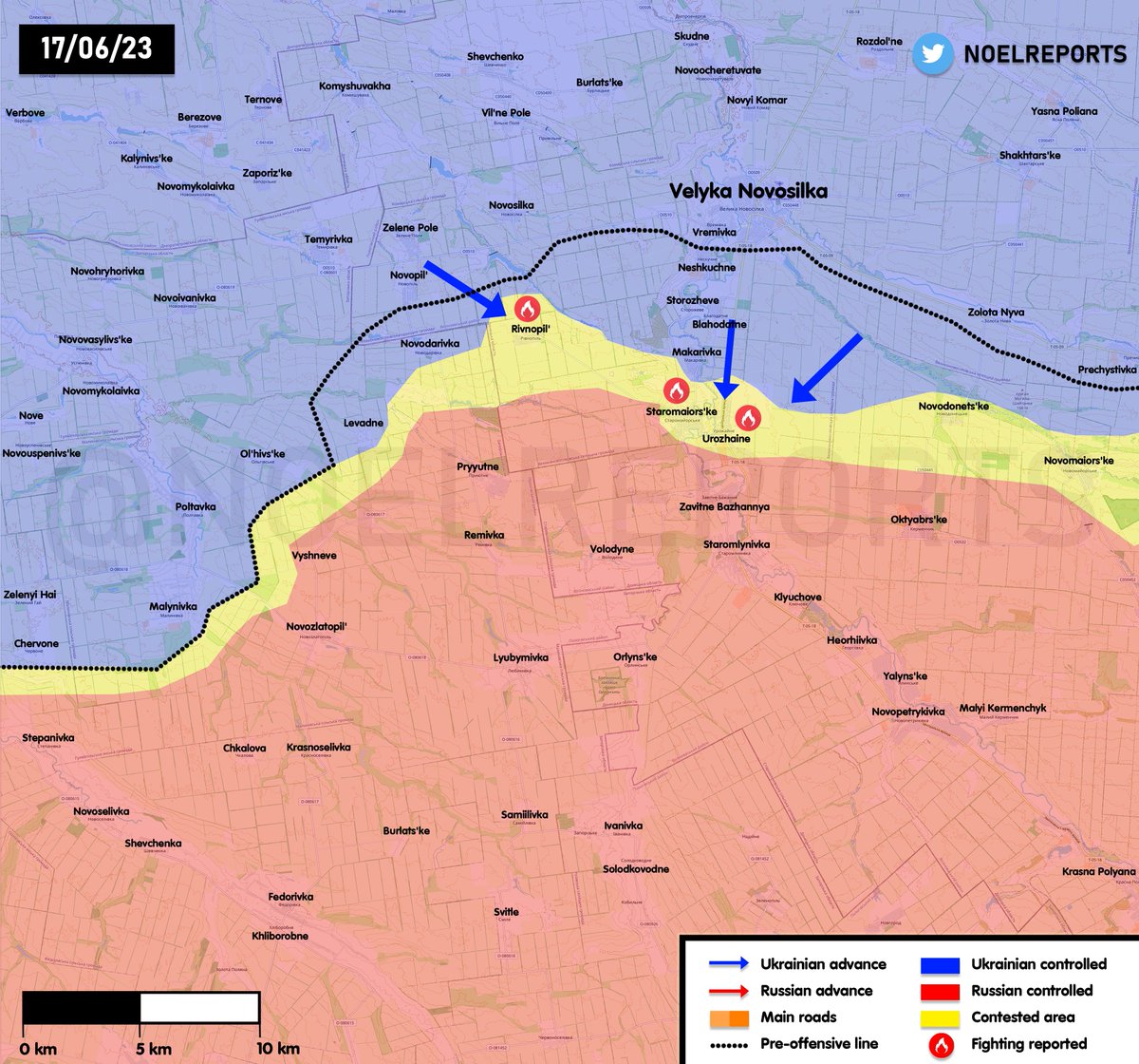 En el frente de Velyka Novosilka no hubo avances como en días anteriores salvo en las zonas de Makarivka y Novozlatopil. En el norte, los ataques rusos en Kremina y Svatove fracasaron. En Bakhmut el avance ucraniano fue menor respecto a días anteriores, salvo en Rodzolivka