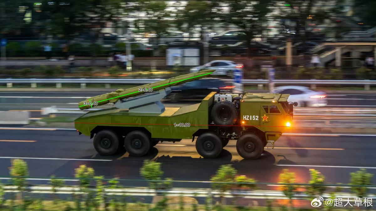 3 | The SX2306 8x8 truck that carries the missile mockups is roughly 10 m's long. We can roughly estimate that the new SAM (with booster) is about 6.4 m's long, which is close to the 6.5 m length of the previous HQ-9/HHQ-9 variants.