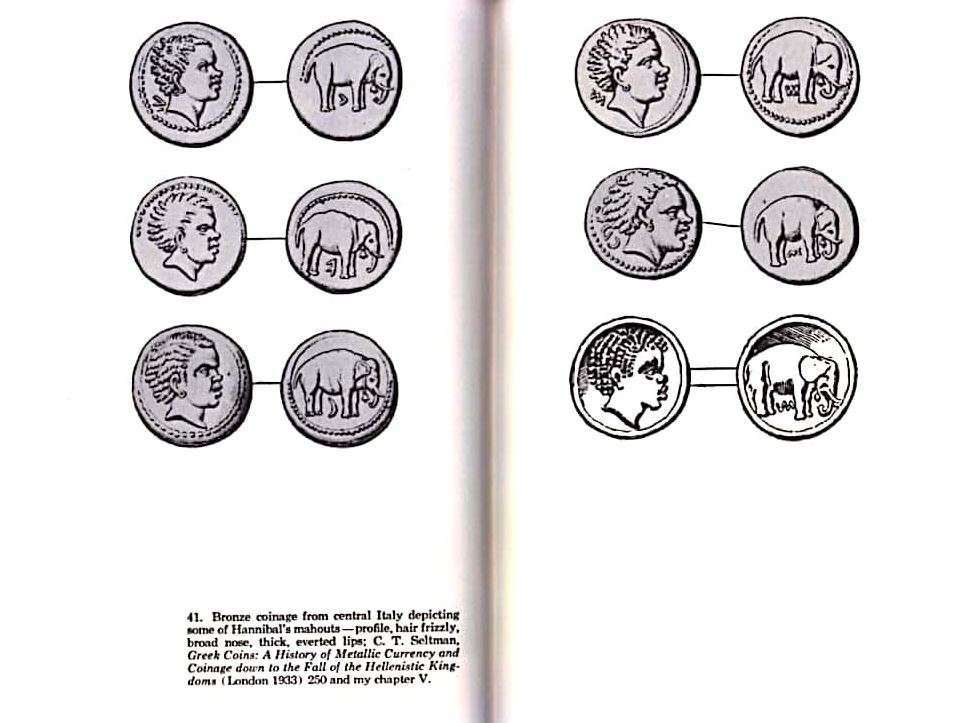 It appears that these elephants were often guided by black/aethiopian mahouts, as evidenced by numerous depictions on Etruscan coins and terracotta figurines but the origin of these riders is unclear.