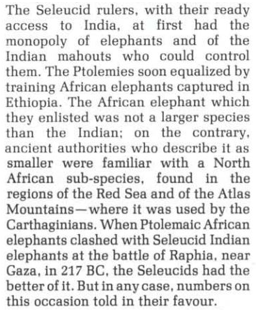 Carthage, dependent on the favor of Numidian monarchies for their supply of elephants, occasionally had to seek assistance from the Greco-Macedonian monarchies. This allowed them to acquire larger Asian elephants capable of carrying towers.
