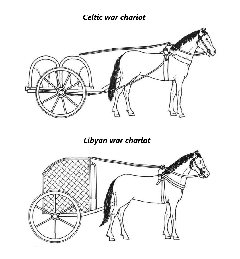 It is worth mentioning that war chariots were employed by certain Libyan and Celtic tribes. The Libyans were mentioned during Agathocles' invasion of Africa in 310 BC, where they allied with him. The Romans also noted the frequent usage of chariots among noble Celts.