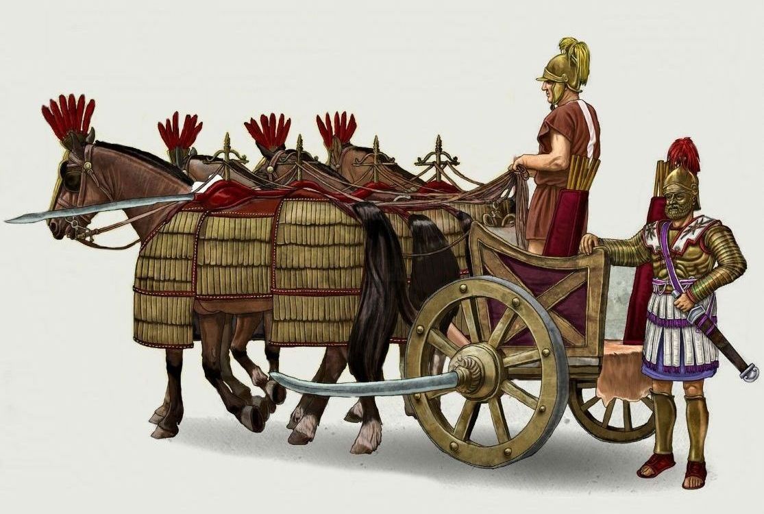The existence of these chariots in the Middle East dates back to the 2nd millennium, making them an archaic feature that persisted in Carthaginian armies until relatively late. Scythed chariot would have especially been used by persians during the Vth cent. BC