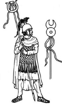 Carthaginian army standards featured crescent shapes with horn-like ends, ribbons, lunar crescents, and sun discs. These symbols held celestial and religious meaning, associated with the goddesses Tanit and Astarte. They likely adopted them from the Babylonian and Assyrian armies