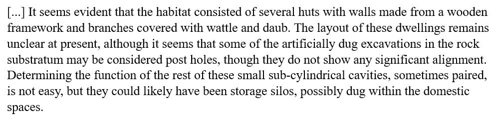 Quadrangular structures are absent, except for one rectangular building with a stone base and earthen walls. The site mainly features round or elliptical huts with post holes, similar to oval-shaped huts found in Ceuta's earliest level (8th century BC).