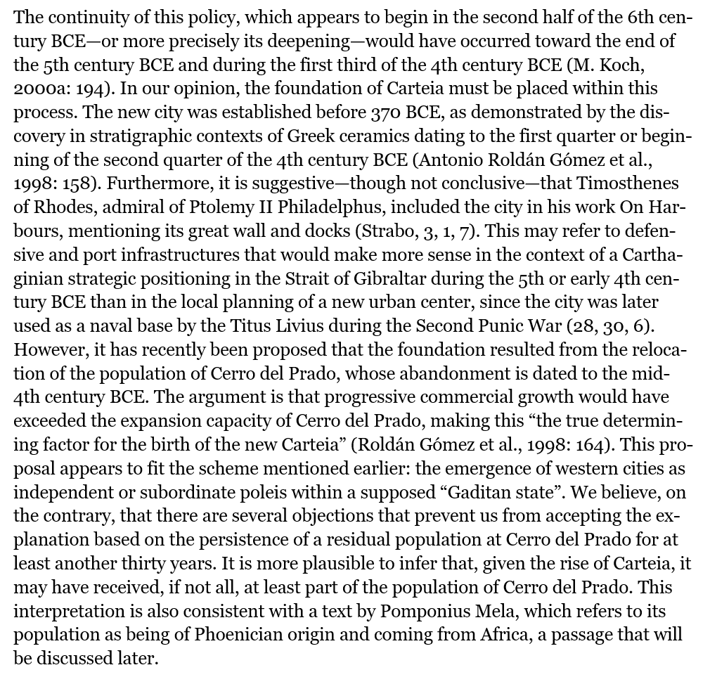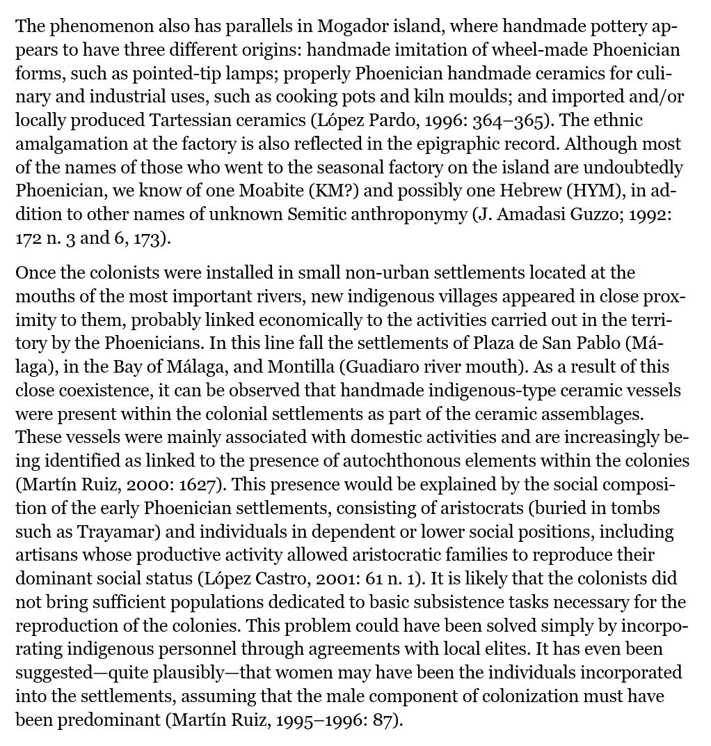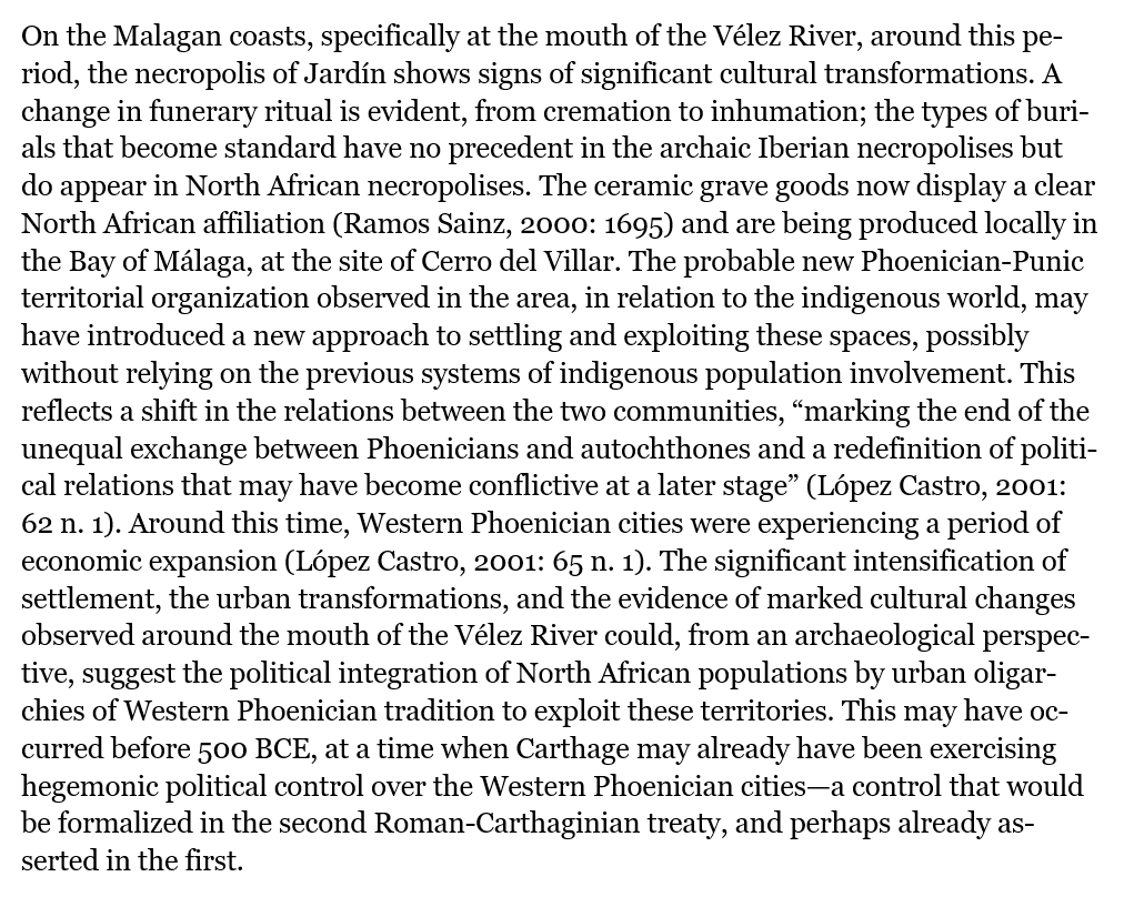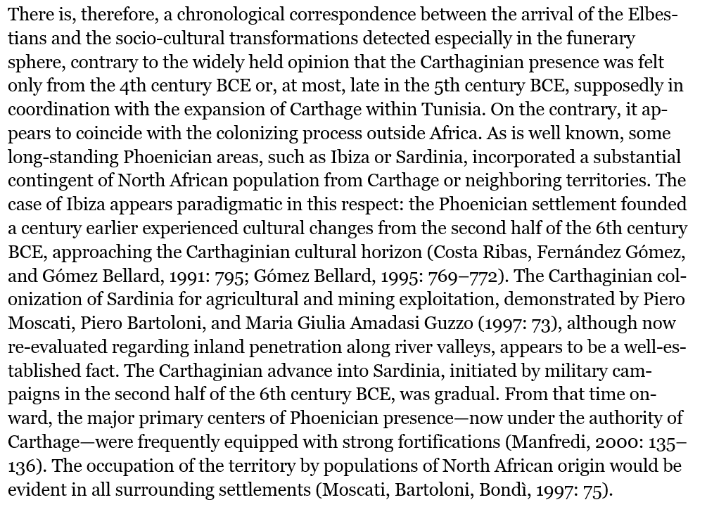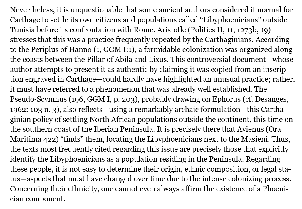 Starting in the second half of the 6th century BC, Carthage undertook a vast colonization program involving the sending of North African settlers to SE Spain as well as to Ibiza and Sardinia. These population transfers did not necessarily imply military conquest or the annexation of large territories, but rather the dispatch of colonists to pre-existing sites or new foundations in order to develop colonial enterprises in these regions. The massive settlement of these colonists led to a redefinition of relations between Phoenicians and Iberians, which eventually became conflictual. A cultural rupture is also evident, although it was not total and shows that indigenous populations were also integrated into the new foundations. These 6th century settlements are contemporaneous with the mention of a Libyan people living in Iberia, whom Greek sources call the "Elbestians". 🧵