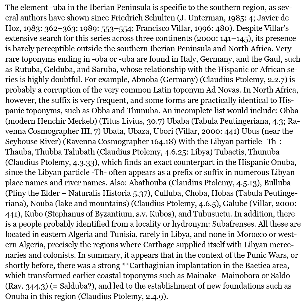 The settlement of these North Africans is also perceptible through toponymy, which was altered and acquired a Libyco-Phoenician aspect (-uba/-oba is a Libyan element meaning "fortification" for example). The analysis of these toponymic data shows evident links with eastern Algeria and Tunisia, which indeed provided contingents of colonists and mercenaries to Carthage. This colonization policy experienced two further phases at the end of the 5th century and at the beginning of the 4th century. The foundation of Carteia must be placed within this context and according to Pomponius Mela, this city was inhabited by "Phoenicians from Africa", a term that is generally interpreted as referring to Libyphoenician or Punicized Libyan populations.
