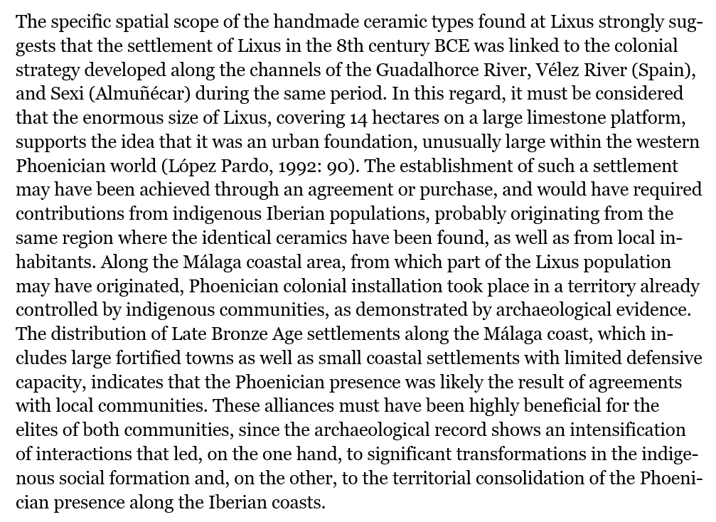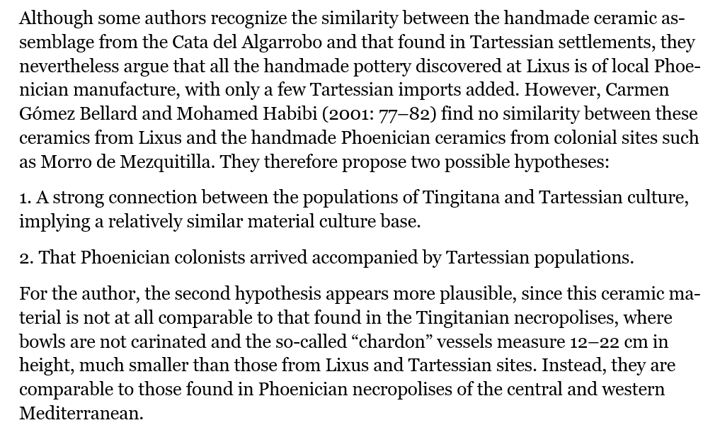 In Northern Morocco, the handmade pottery found in the earliest layers of Lixus suggests that its foundation involved not only Phoenicians but also Tartessians (it should be noted that other studies indicate that the site was already occupied at the end of the Bronze Age, making it likely that the Phoenicians settled in the surrounding area rather than replacing earlier inhabitants and hence why the Pseudo-Scylax mentions for Lixus a "city of the Libyans" and a "city of the Phoenicians"). These movements and settlements therefore appear to have involved Phoenicians, locals, and Tartessians. This ceramic assemblage also shows strong similarities with productions from eastern Andalusia. As in the case of Spain, the establishment of such a site could only have been achieved through agreements or purchases with local populations, and the archaeological record suggests the participation and interaction of Iberian and Berber groups. A comparable situation can be observed about 400km further south on the island of Mogador, where, somewhat surprisingly, the site may also have hosted Moabites and Hebrews. Furthermore, whether in Spain or North Africa, the Phoenician settlement of these regions, especially near river mouths, encouraged indigenous populations to establish settlements in close proximity. These local groups were gradually integrated into Phoenician colonial communities and appear to have provided agricultural labor and women, since Phoenician colonization was predominantly carried out by male settlers.
