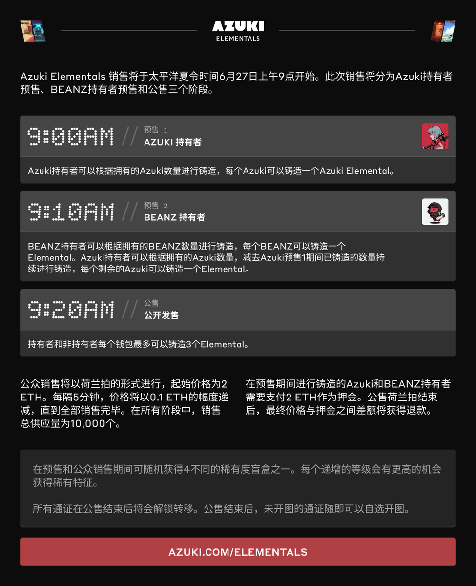 All official announcements and updates for this sale will come directly from @azuki Twitter, Discord and . Always make sure you are on the https://t.co/Ha9KyXkdxy website domain before connecting your wallet. There will be no early access before 6/27.Azuki.com Azuki.com