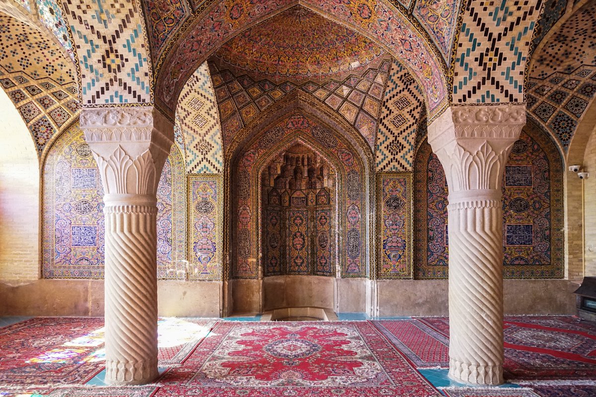 The Qajars built a great many palaces and mosques and gardens, all of them lavishly, but nothing perhaps more exquisite than the Nasir ol-Molk, or Pink Mosque, in Shiraz.