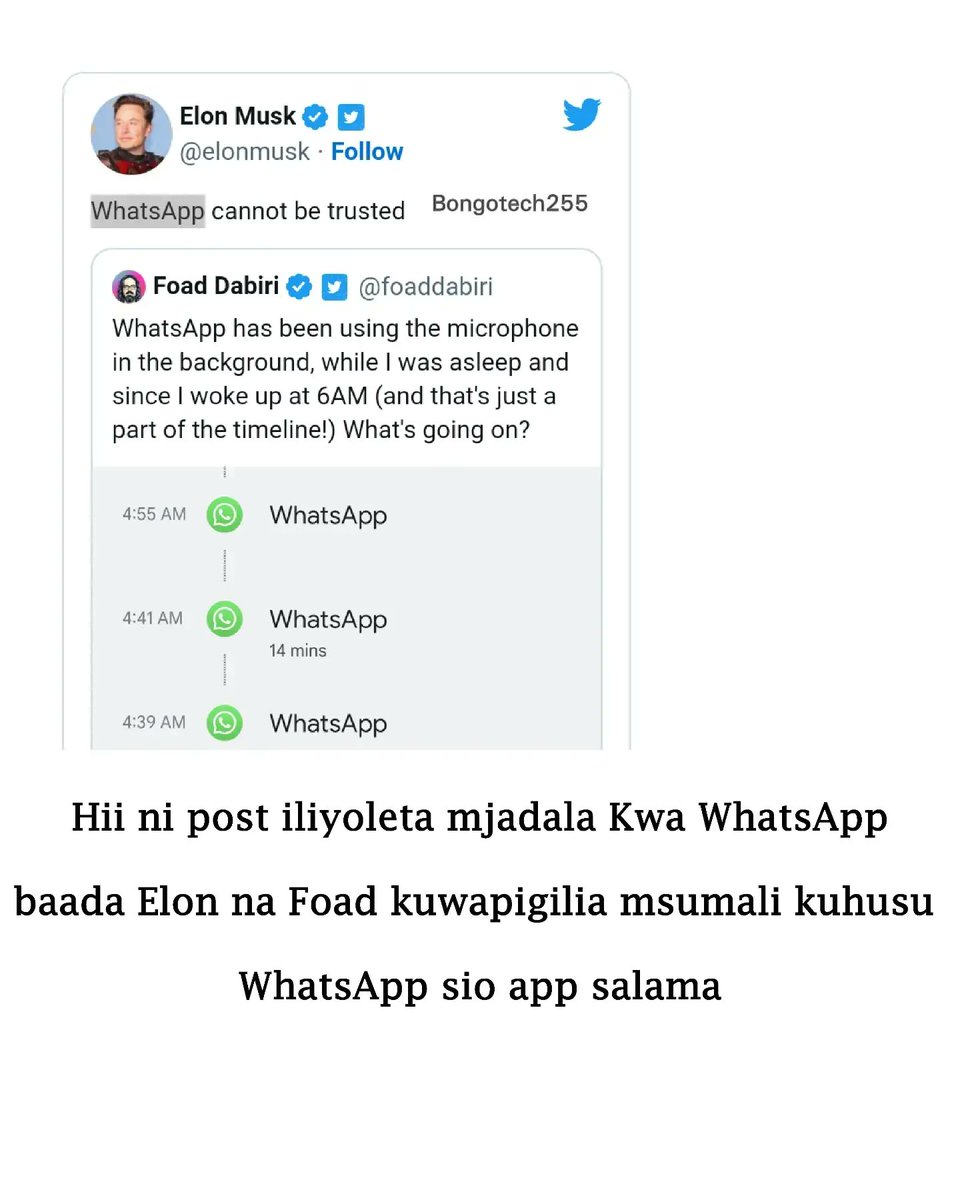 Mmiliki wa Twitter anasema Whatsapp sio sehemu salama ya kuaminika, baada ya Engineer wa Twitter akipost kuwa Whatsapp inatumia microphone kusikilizia vitu vyake bila yeye kujua wakati amelala.