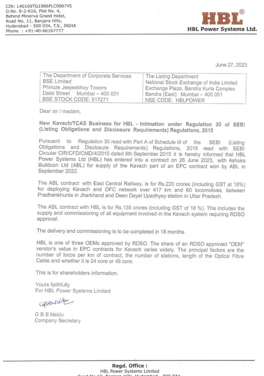 HBL wins Railway KAVACH order worth ₹220 Cr.