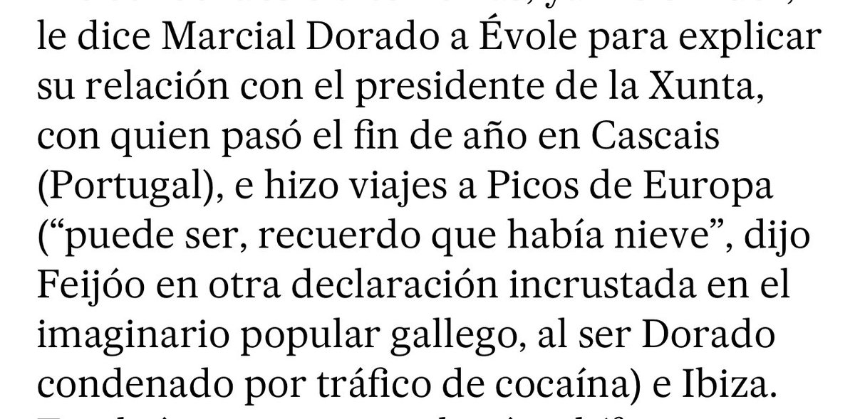Recordemos que Feijóo ha reconocido haber viajado en esa época con el narco Dorado a Portugal, Canarias, a un lugar que no quiere nombrar pero “donde había mucha nieve”