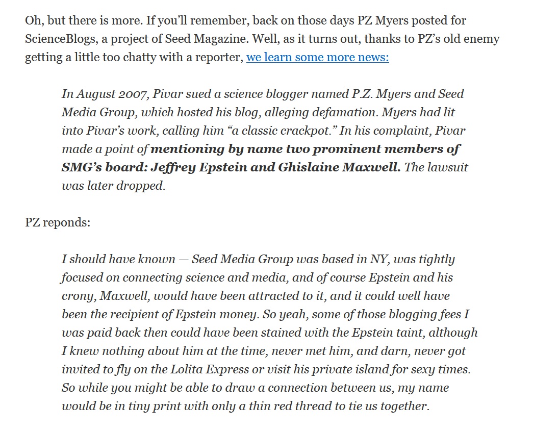 "I was tangentially involved with another character who was the recipient of Epstein’s beneficence. John Brockman was my agent, too. I published in a few of his annual question books, he got me a good advance on The Happy Atheist..."