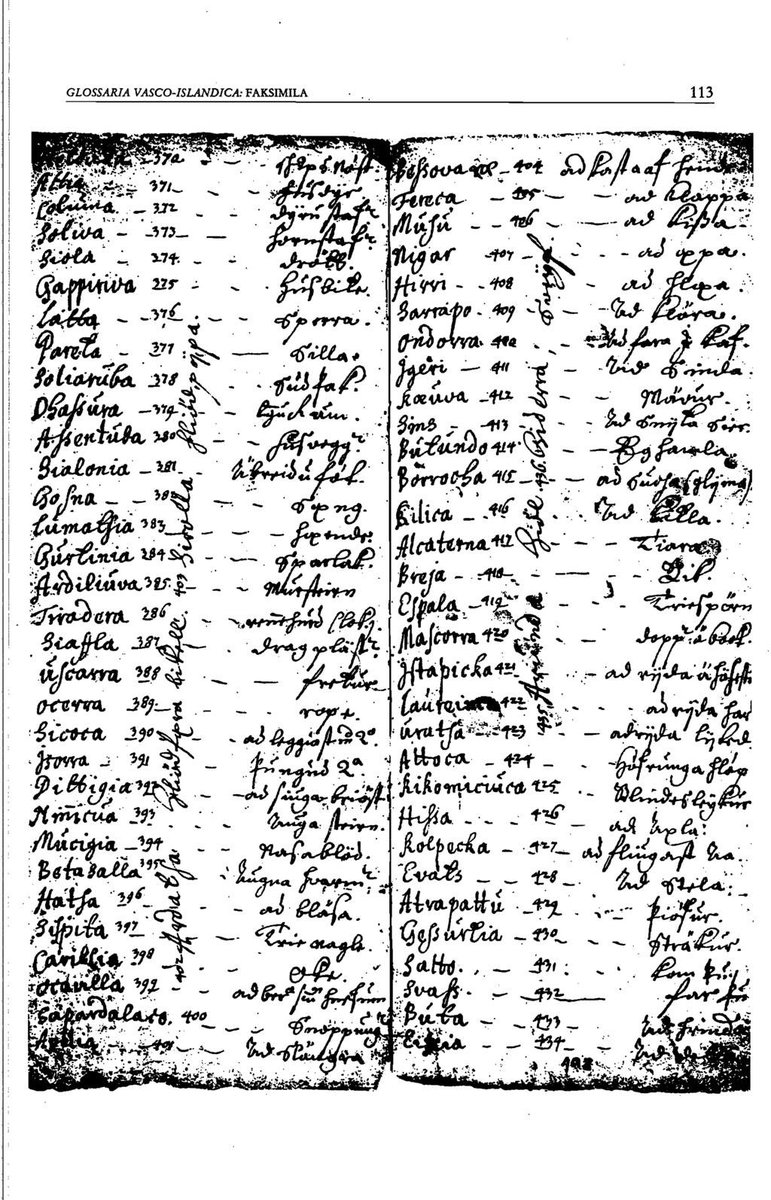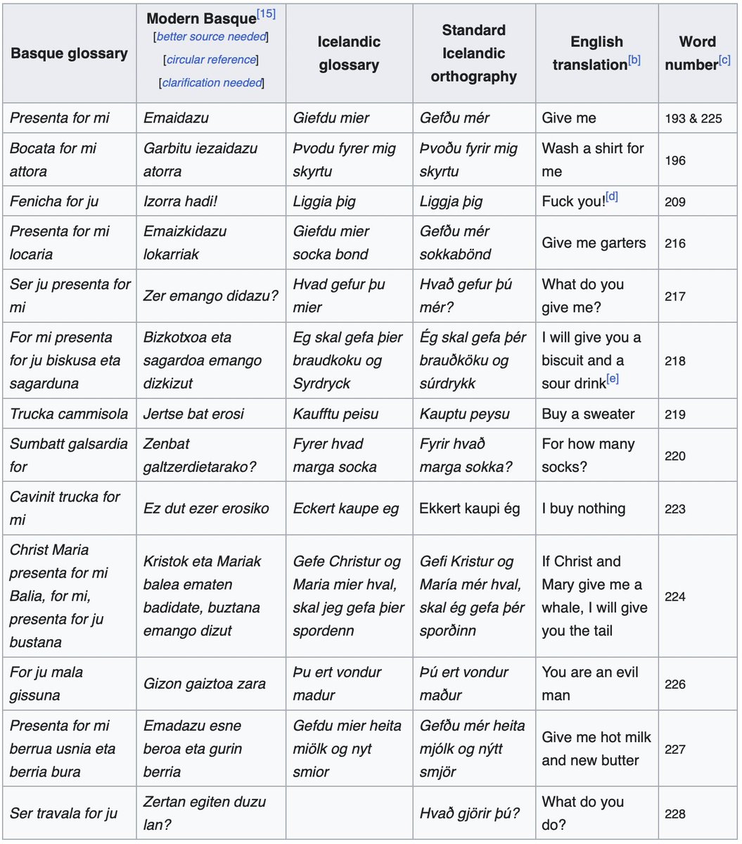 Si tratta di una serie di glossari (l’ultimo ritrovato nel 2008) che riportano parole o intere frasi di uso comune grazie alle quali balenieri e locali riuscivano a capirsi, in uno straordinario misto non solo di lingua basca e islandese, ma anche di francese, spagnolo e inglese.