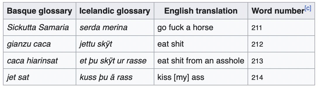C’è anche una sezione dedicata agli insulti (pure questi direi utili), che non ha bisogno di troppe interpretazioni. “Sickutta Samaria” e “Serda merina” suonano entrambe benissimo, dunque viva i Paesi Baschi e viva l’Islanda – e già che ci siamo viva anche il Tour de France ✌️