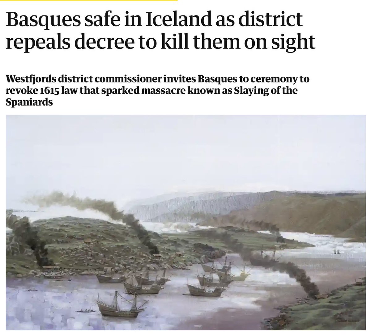 Il secondo è che la vicenda è tornata prepotentemente in auge nel 2015, quando, a 400 anni dagli avvenimenti, l’editto sulla libera uccisione dei baschi nei fiordi occidentali fu infine revocato. Nei quattro secoli precedenti nessuno si era infatti curato di abolirlo formalmente.