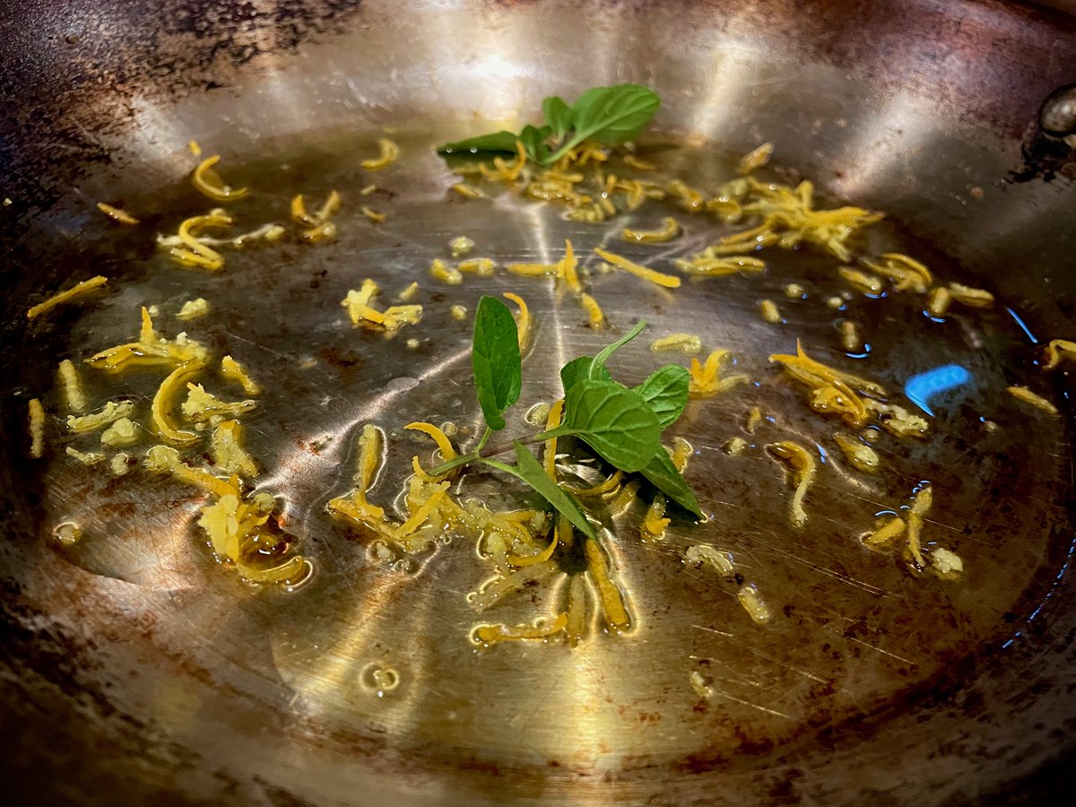 In a medium pan on low heat, infuse some olive oil with a bit of your lemon zest and some mint/basil stems. IMPORTANT: Do NOT COOK this. You are simply infusing the oil a bit as your water boils.