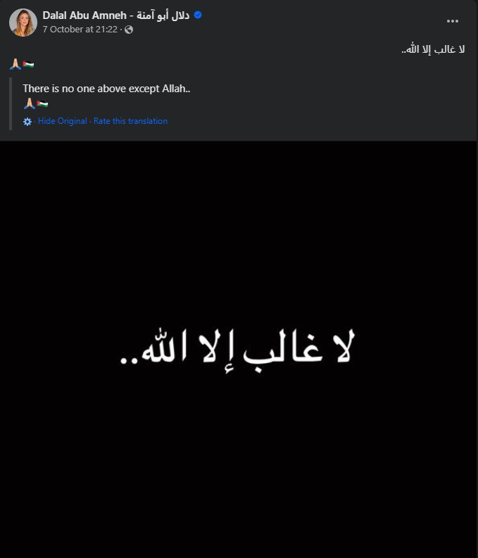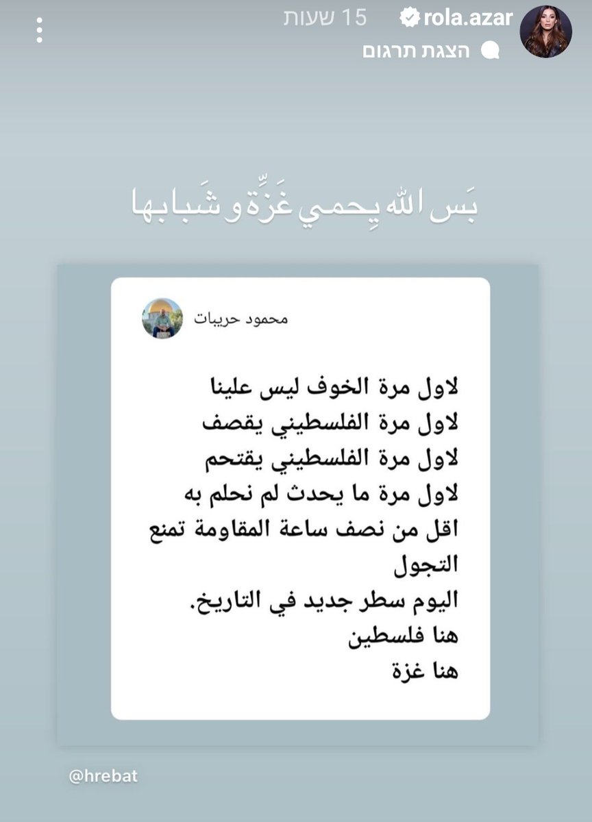 - משתפת פוסט: "לראשונה לא אנחנו פוחדים, לראשונה הפלס' מפציץ, לראשונה הפלס' מסתער, לראשונה קורה מה שאנחנו לא חלמנו עליו, תוך פחות מחצי שעה ההתנגדות (חמאס) עוצרת את התנועה, היום זו שורה חדשה בהיסטוריה, כאן פלסטין, כאן עזה" ומוסיפה: "שאללה ישמור על עזה וצעיריה"