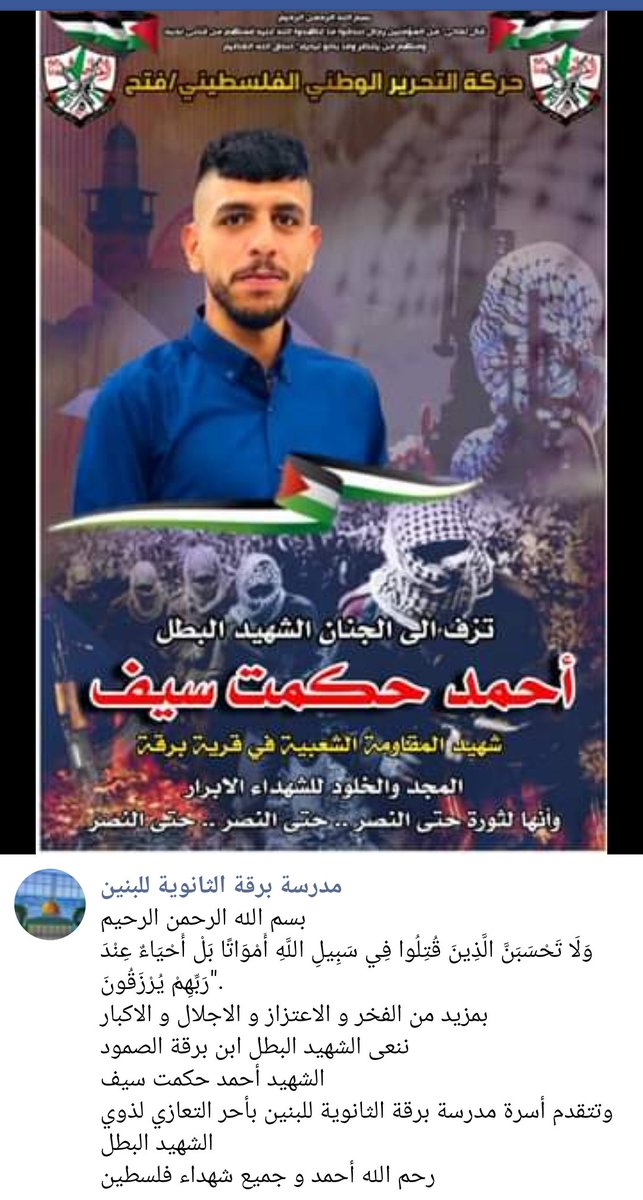 פוסט על המחבל אחמד סיף שנהרג בעימותים בכפר ברקה: