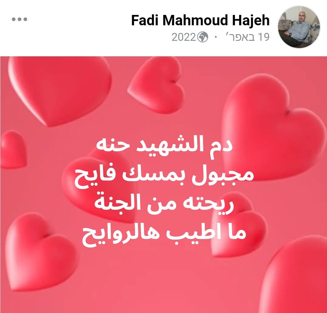 ונסיים עם פוסט נוסף של פאדי המנהל הדגול שפרסם שיר שכתב המשורר אבראהים טוקאן בשבח "שלושת הגיבורים" - עיתוי הפרסום לאחר שנהרגו שלושה מחבלים בשכם, בהם אבראהים נאבלסי