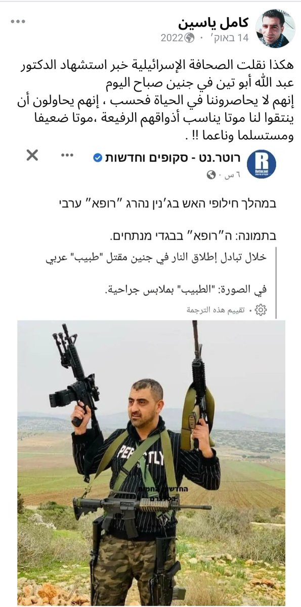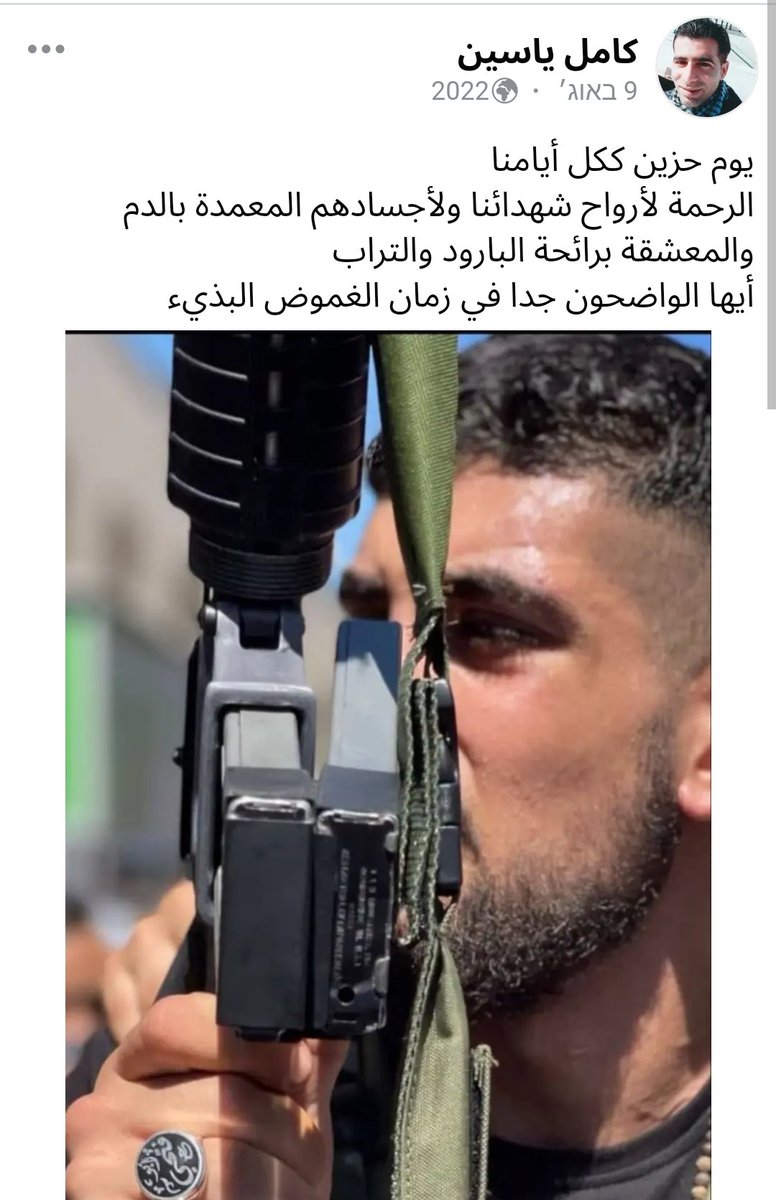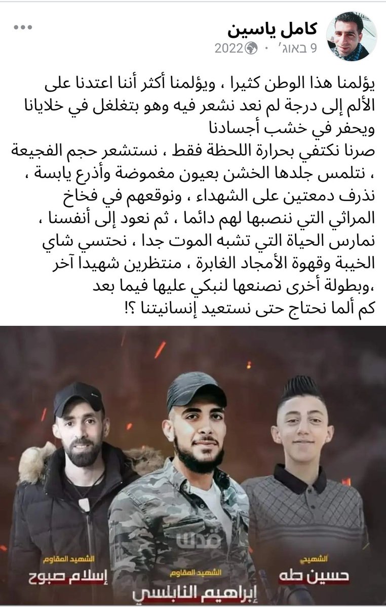 פוסט אבל וכאוב שלו על מותו של המחבל אבראהים אלנאבלסי: