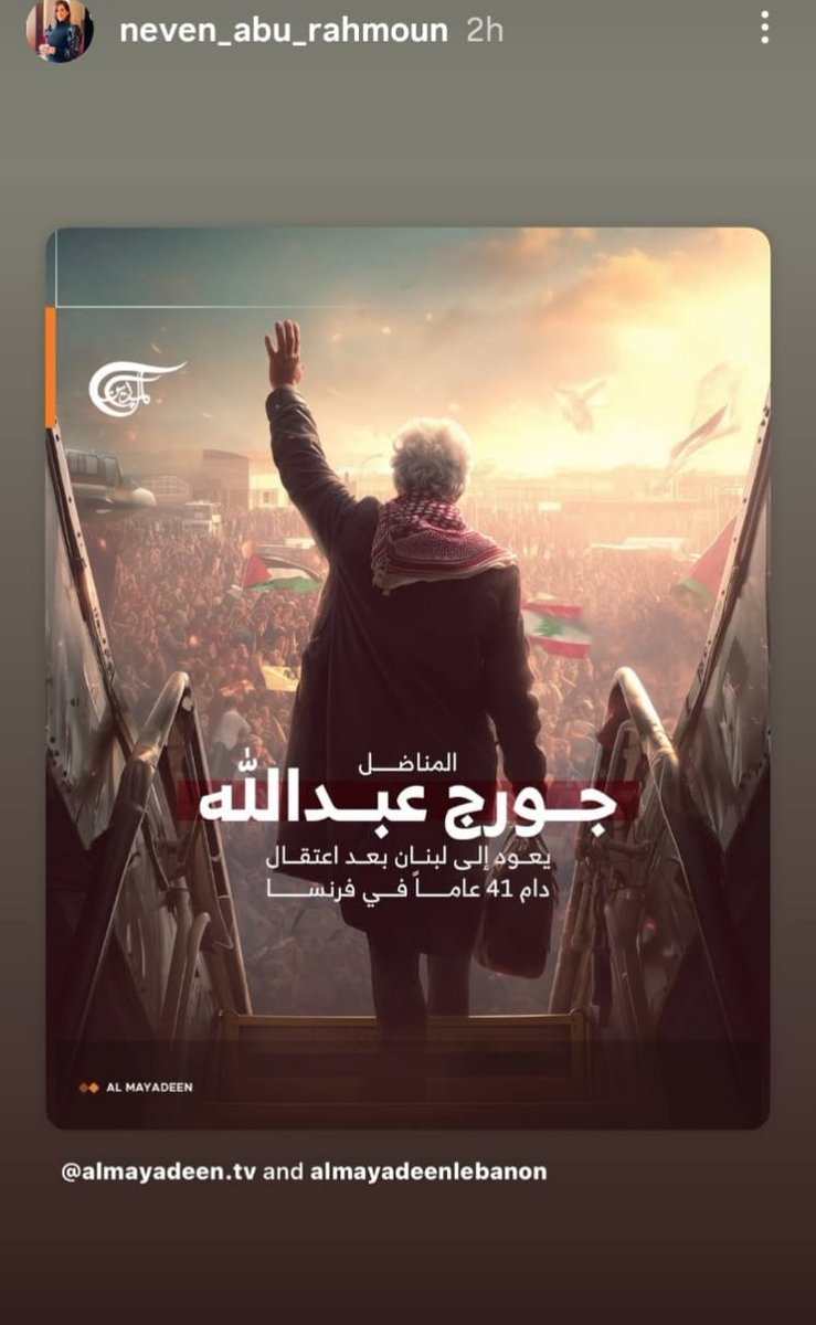 ניבין אבו רחמון, מורה בישראל, וח"כית לשעבר מטעם מפלגת בל"ד, שיתפה האדרה שלו מערוץ אלמיאדין: "הלוחם ג'ורג' עבדאללה חוזר ללבנון לאחר מעצר שנמשך 41 שנה בצרפת"