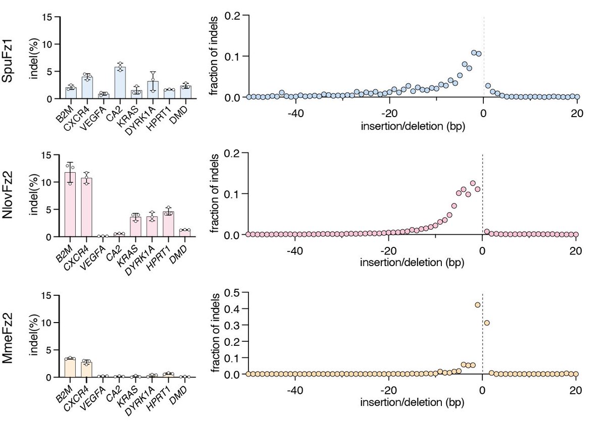 6/x To boost in vivo editing, we focused on Fz1 from the fungus Spizellomyces punctatus (SpuFz1), and optimized both the ωRNA and protein component, achieving a nearly 10-fold increase in activity (max. 18.4% indel formation) on the human genome.
