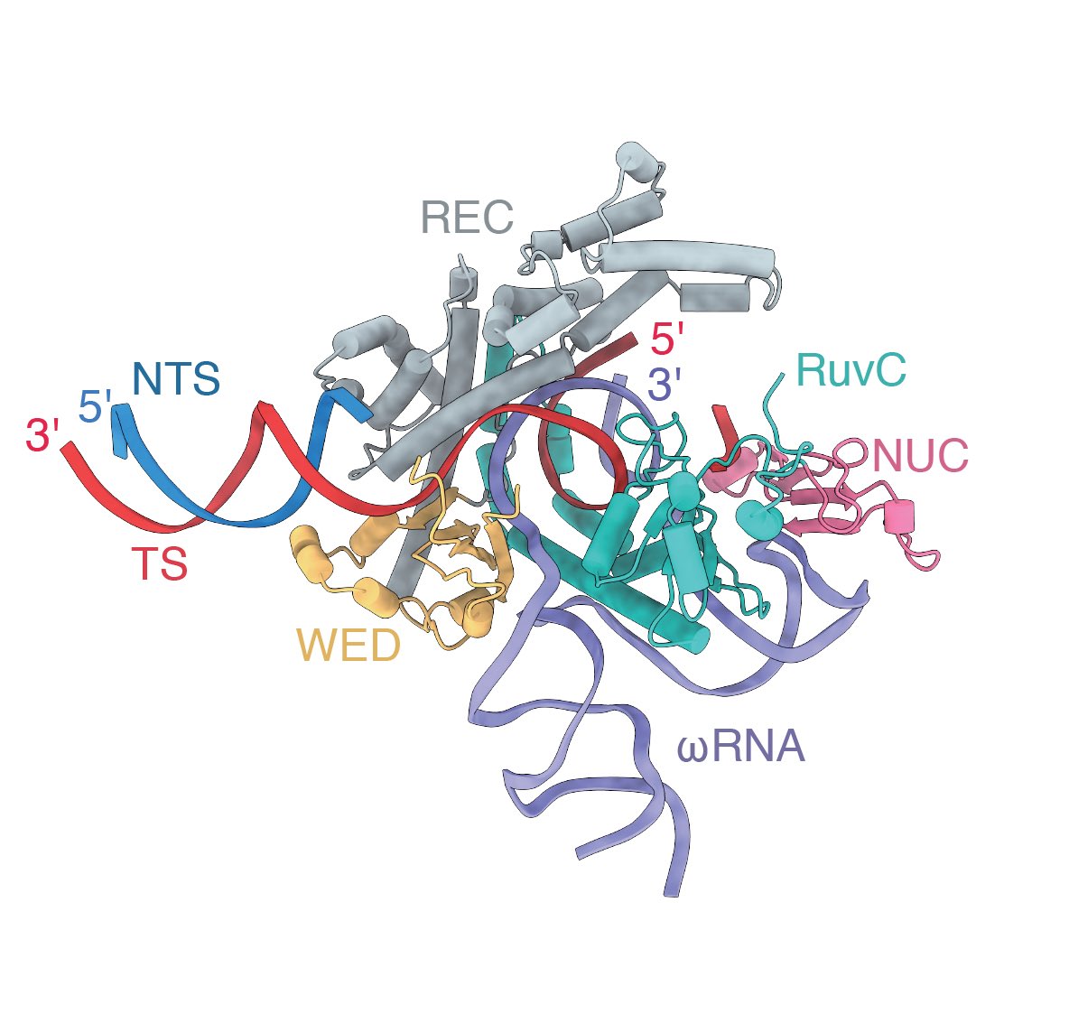 8/x Fz shares structural similarities with TnpB and Cas12, but the interaction between the ωRNA and the catalytic domains of Fz is notably more extensive, suggesting that the ωRNA might play a role in the catalytic reactions involving Fz.