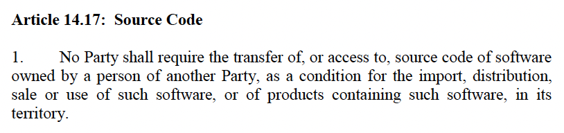 “require the transfer of, or access to, source code of software owned by a person of another Party, as a condition for the import, distribution, sale or use of such software, or of products containing such software”, which is language copied verbatim from the CPTPP.