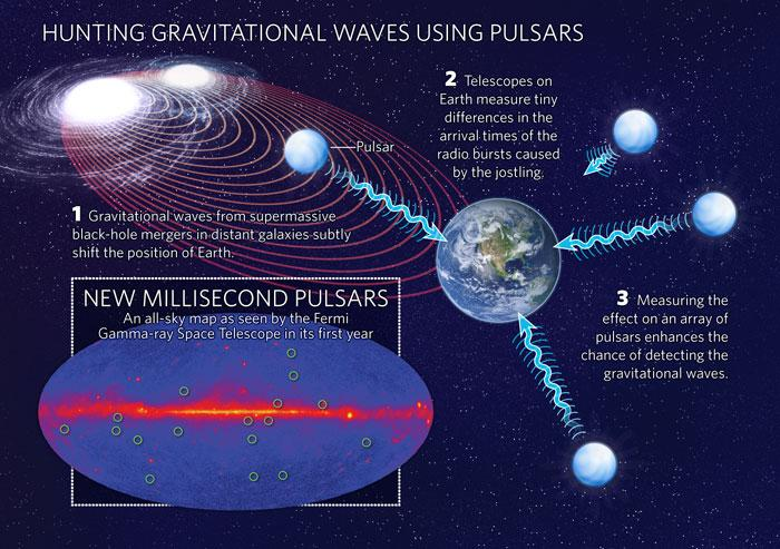 En mesurant près d'une centaine de pulsars pendant 15 ans, des astronomes ont pu découvrir des ondes gravitationnelles dans ce nouveau domaine de fréquences: a priori on observe plein de trous noirs supermassifs qui tournent les uns autour des autres. C'est hallucinant non?
