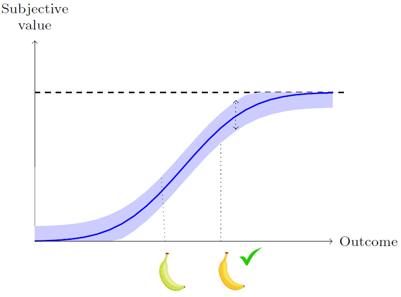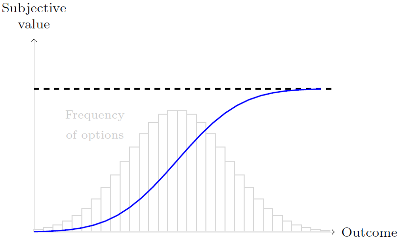 Since satisfaction is bounded, it can't be steep everywhere. The question is then: "Where should the slope of subjective satisfaction be steeper to limit mistakes?"