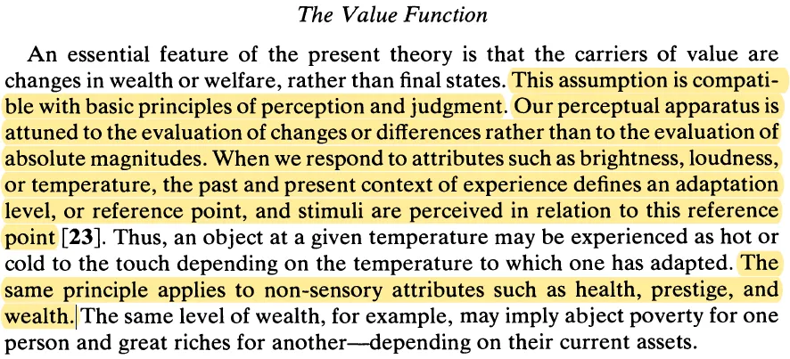 Since its publication in 1979, "Prospect Theory" by Kahneman and Tversky has become the most cited article in economics. One of its key ideas is that people value what they have by considering it as a gain or a loss relative to a subjective "reference point".