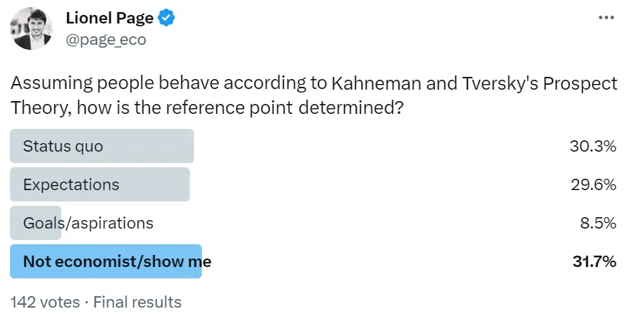 What is this reference point? Kahneman and Tversky did not propose a strict definition. It could be the status quo (what you have), expectations (what you think you'll get), or aspirations (what you would want to get).
