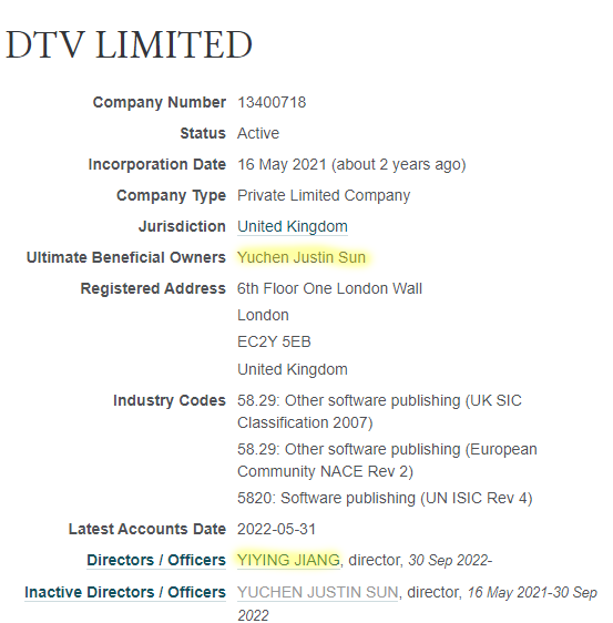 But, a Yiying Jiang does show up on another company. DTV Limited - the UK holding company of DLive by Bittorrent.