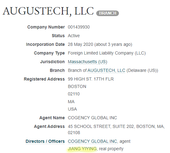 If we go back to Poloniex which was initially held under Augustech LLC, we'll see Jennifer Yiying Jiang again, holding it on behalf of Sun before he admitted ownership.