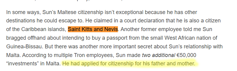 One thing that has been mentioned in interviews is that he applied for citizenships in multiple island nations for his parents as well.
