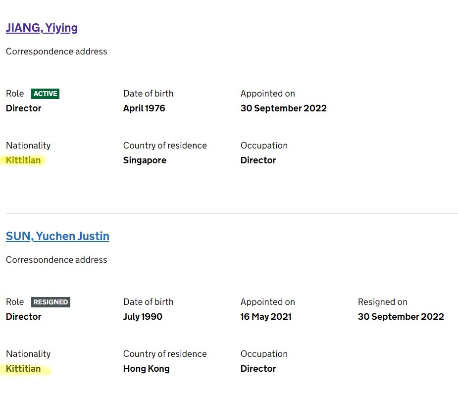 And on the British filing (addresses removed) it notes that both Yiying and Justin are "Kittitian" aka have citizenships from St. Kitts and Nevis.