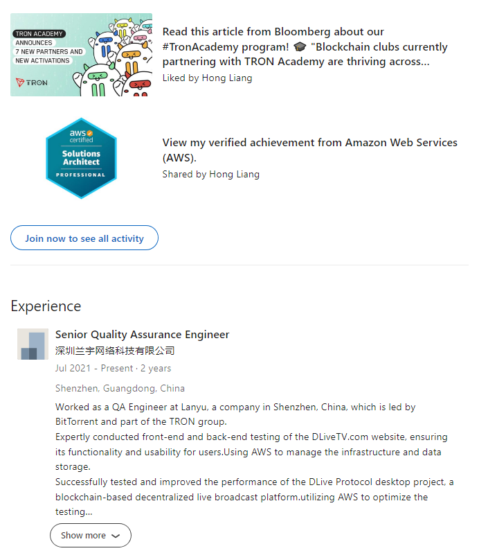 Or QA analyst Hong Liang, who does QA for Bittorrent, Tron and DLiveTV.
