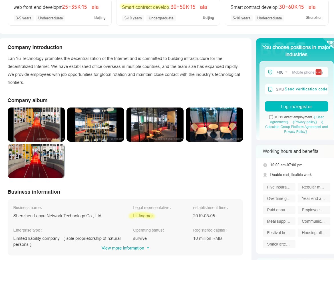And the job listing site that lists Li Jingmei as the owner, and is hiring smart contract developers.