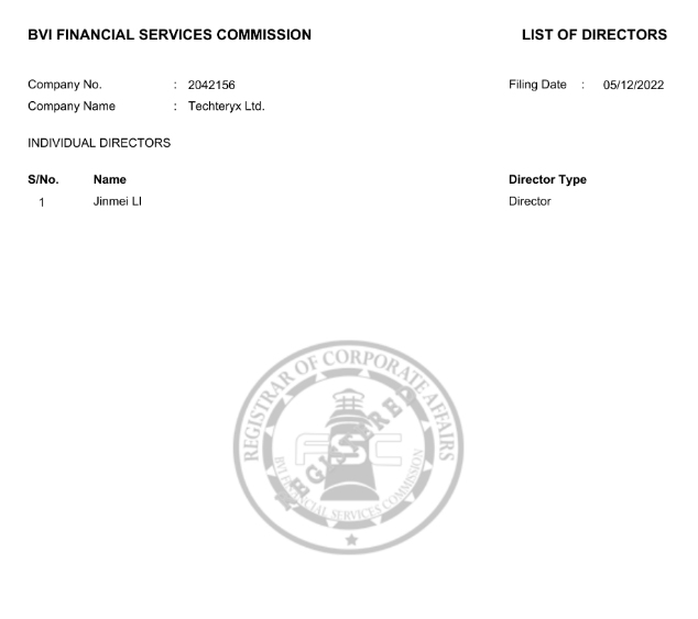Switching back to Yiying Jiang now, aka, the Jennifer Jiang who signs on behalf of Techteryx.