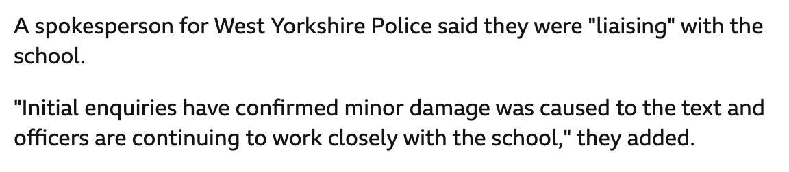 This story raises a lot of questions. By the school's account the Qu'ran was not kicked around (as local rumour suggested) and there was "no malicious intent" behind its minor damage. The photograph in the story shows slight scuffing on one page (1/3). bbc.co.uk/news/uk-englan…