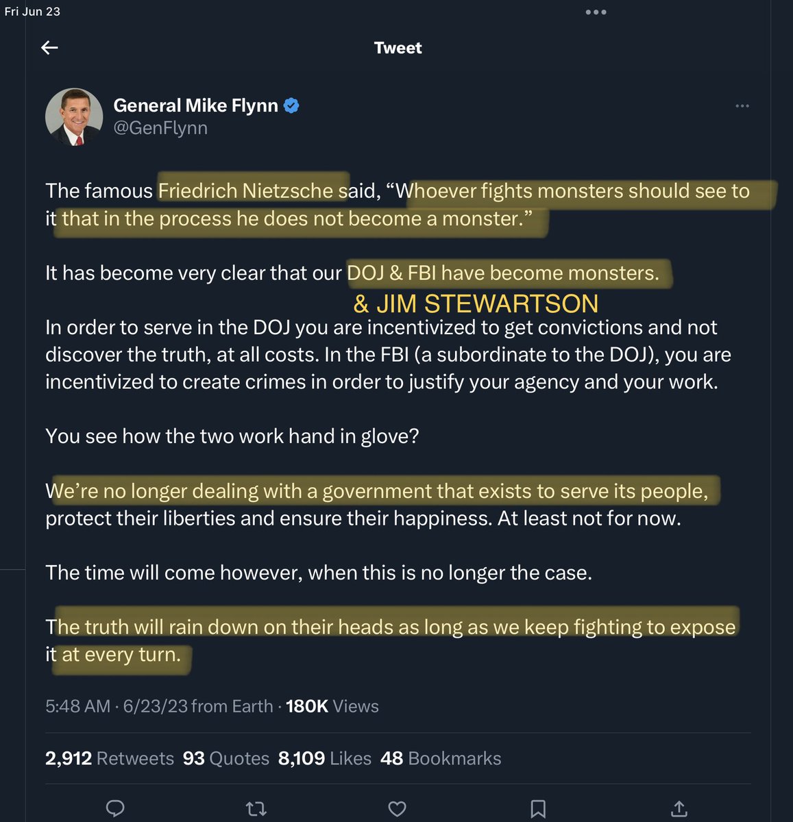 — The lawyer Flynn’s using to sue @TheJusticeDept, the @FBI and Dept. of Jim Stewartson, @jbinnall, had people flip on him to Jack Smith.