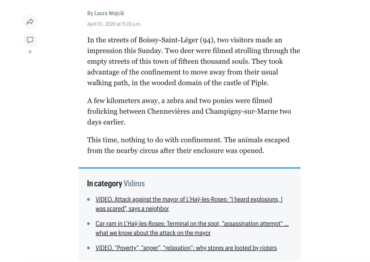 This one, showing a zebra on a street at night, first appeared online in April 2020. A Le Parisien article explained at the time that the zebra had escaped from a nearby circus.