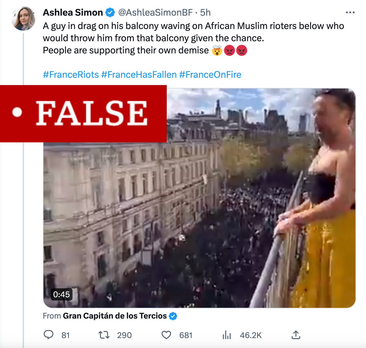 Britain First's Ashlea Simon falsely claims this video shows a man "waving at Afircan Muslim rioters" from a balcony in Paris during the current riots.