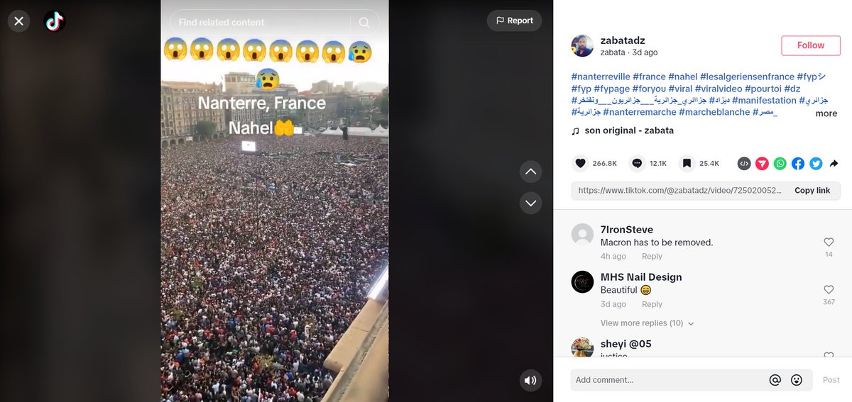 This TikTok video, viewed 9.5 million times, claims to show a large crowd in Nanterre, where Nahel M was shot dead by police.
