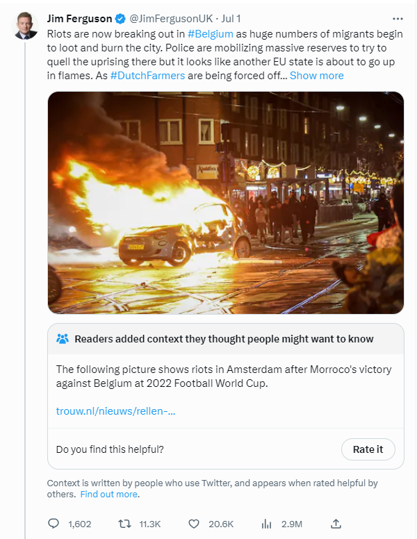 A former Brexit Party candidate claims this image shows riots now breaking out in Belgium by migrants looting and burning cities. It has 11,000 retweets and 20,000 shares.